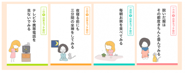 この電子書籍では、テレビを見ない、雑巾を使って掃除をする、正座で暮らす…など全部で24個の「プチ修行」を紹介しています。 1日で出来るものから、3日間でできるもの、1週間で出来るものに加え、1カ月続けて行うものと、4つのカテゴリにわけ、各章6個ずつ解説しています。