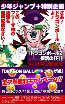 劇場版『ドラゴンボールZ 復活の「F」』の公開を記念し、『DRAGON BALL カラー版 フリーザ編』全7巻を、マンガ誌アプリ「少年ジャンプ+」上で毎日1冊まるごと無料配信いたします。無料配信キャンペーンの期間は、4月7日(火)昼12時から4月14日(火)昼12時までで、毎日1巻ずつ配信を行います。鳥山明氏のカラーイラストをもとにしたオリジナル壁紙も、キャンペーン期間限定で無料配信いたします。