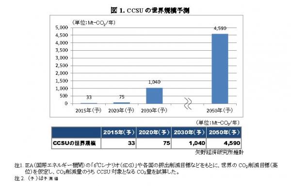 尚、ここではIEA(国際エネルギー機関)の「6シナリオ(6DS)」や各国の排出削減目標などをもとに、世界のCO2削減目標(高位)を仮定し、CO2削減量のうちCCSU対象となるCO2量を試算した。