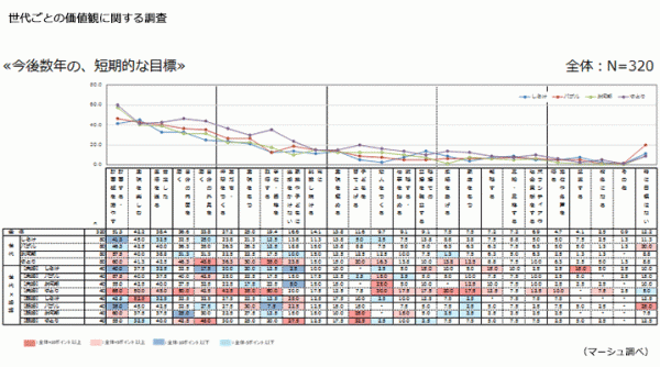 短期的な目標を尋ねると、ゆとり世代は内面・外見共に「自分磨き」が他の世代と比較しても高く、【未婚】しらけ世代は、職場での立場や、転職・起業に積極的な傾向がみられた。
