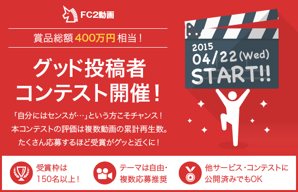 ◆「FC2動画グッド投稿者コンテスト」を開催。賞品総額400万円相当、受賞枠はなんと150名以上!