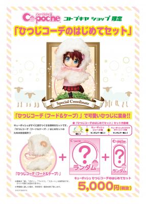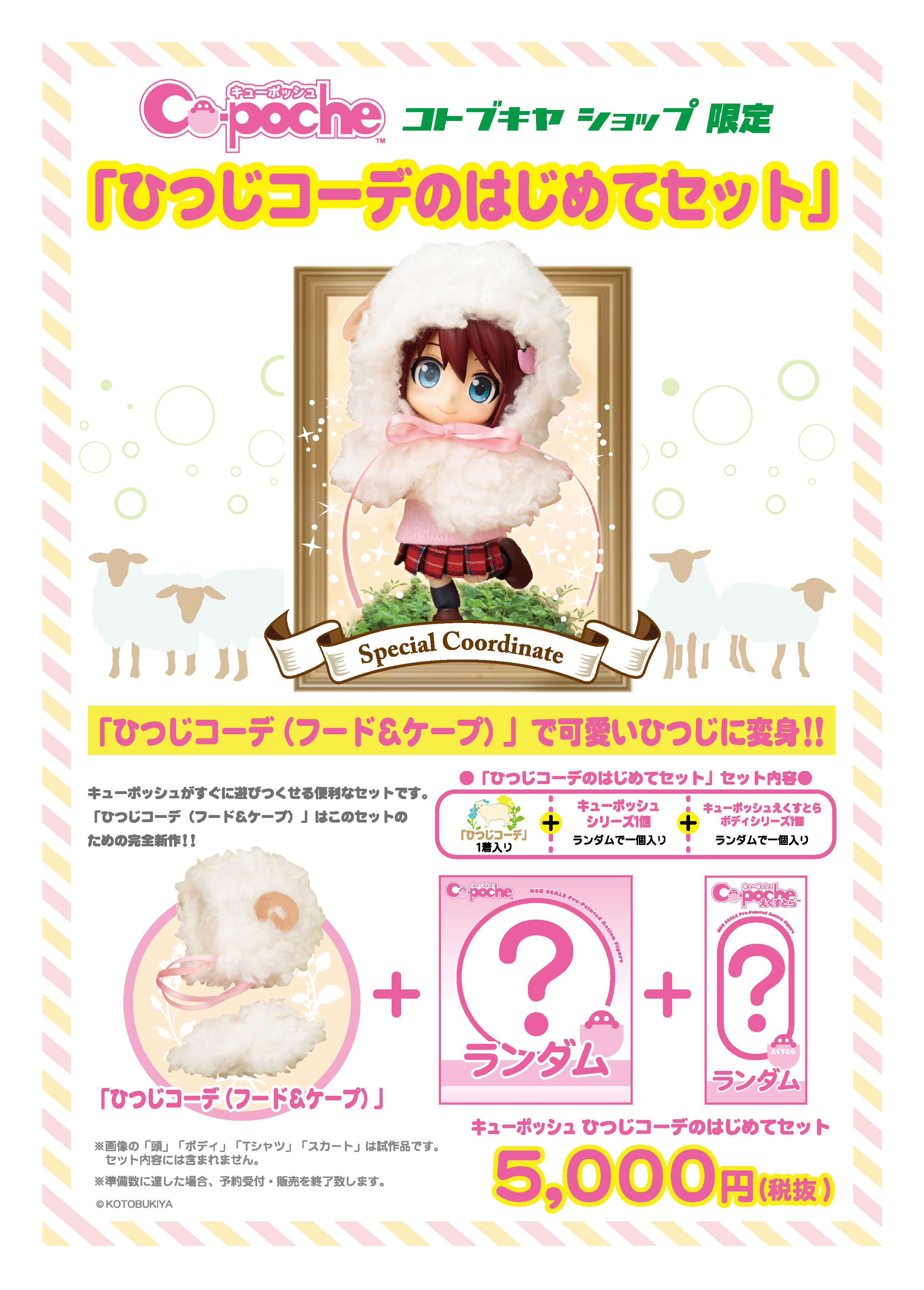 ホビーメーカー株式会社壽屋(本社:東京都立川市曙町/代表:清水一行)は、2.3頭身のデフォルメされたキャラクターを可愛いポケットサイズの可動フィギュアにしたシリーズ「キューポッシュシリーズ」より、初めての方でも十分に遊ぶことのできる商品をセットにした「ひつじコーデのはじめてセット」を2015年5月にコトブキヤショップ(秋葉原館、大阪日本橋、オンラインショップ)限定で発売予定です。