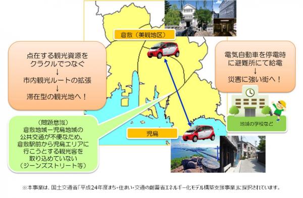 本取り組みは、2014年7月よりEV(三菱自動車製 アイ・ミーブ)1台をリース導入された形での試験運用を開始。車両設置場所である倉敷アイビースクエアを拠点に試験運用を行った結果、利用者は90件を超え、多くは観光用での利用が多かった点から、新たにEV1台を導入し、2台体制として本格稼働されます。