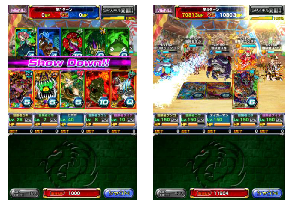 より強い役を作ったチームが先攻となり、相手チームへ攻撃を行います。攻撃時に与えたダメージは