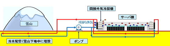 当社は、自然災害リスクの低い青森県において、冷涼な自然の気候を利用した外気冷房と雪氷冷房を併用することによって上記の課題を解決し、世界最高レベルの省エネルギー型データセンターを構築します。青森県は東京よりも5度以上平均気温が低く、年間の約85%はその冷涼な外気を利用した最新の間接外気冷房システムにより、サーバ室を冷却します。真夏期は、冬の間に作り断熱保温された雪山からの融解水の冷熱を利用した雪氷冷房システムを活用します。これらにより、圧縮機を使った消費電力の多いエアコンを一切しない、超省エネルギーで高効率なデータセンターを実現します。