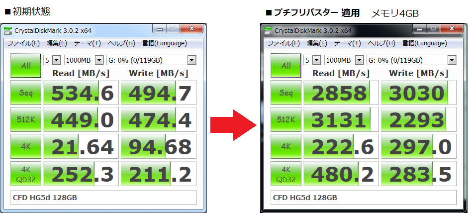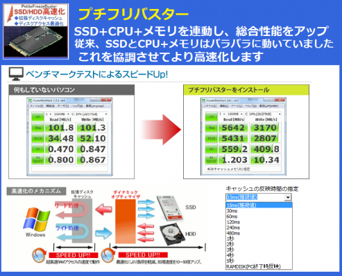 「プチフリバスター」はディスク装置に大容量のキャッシュメモリを付与し高速化します。余剰メモリをディスクにキャッシュメモリとして割り振り高速化します。