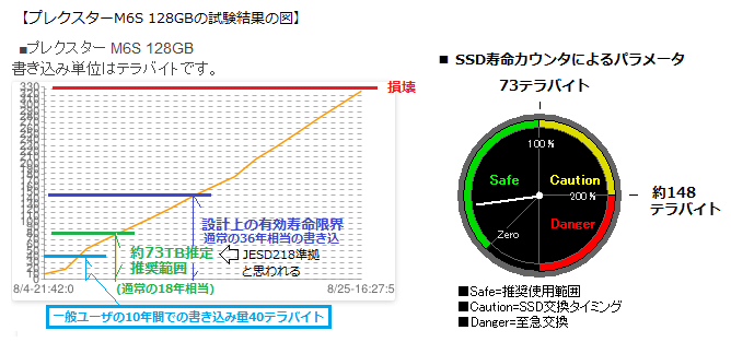 そして一日の平均書き込み量より、SSDの総寿命と残りの寿命を算出します。