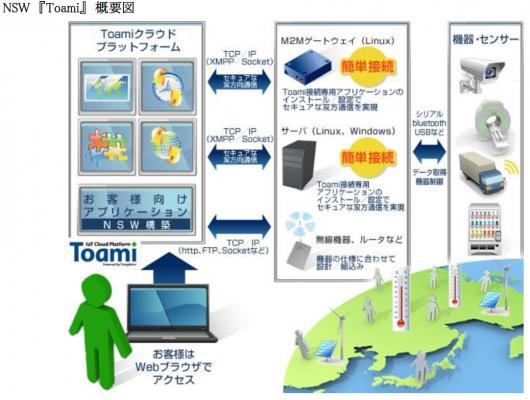 NSWの『Toami』は、M2M/IoTサービスを開発・構築するための専用プラットフォームです。デバイス管理やデータ管理、外部連携機能などを網羅したノンプログラミング開発基盤により、開発効率の大幅な向上とコスト削減を実現しています。