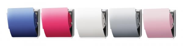 パール入りのカラー塗装を施した表面は、ラウンドフォルムの陰影が映えるきれいな仕上がり。ブルー、ピンク、ホワイト、シルバー、ライトピンクの5色のラインアップは、書類ごとの使い分けにも便利です。