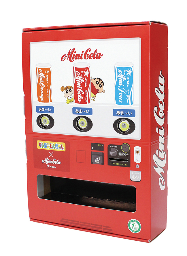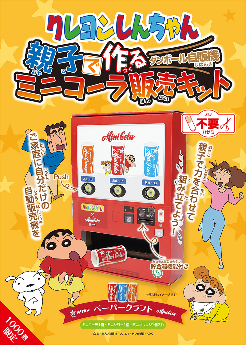 「ほんをうえる」は、ダンボールで自販機を作り動画サイトに投稿することがブームとなっていることに着目。多くの自作自販機でミニコーラ(ラムネ菓子)が使われていることから、ミニコーラを製造・販売するオリオンとダンボール自販機制作キット『クレヨンしんちゃん 親子で作るミニコーラ販売キット』を共同開発しました。書店向け商品として販売します。自販機本体には新作映画が公開中の「クレヨンしんちゃん」のイラストが描かれ、こどもの日の贈り物にも最適なペーパークラフトです。ノリやハサミは不要ですので、親子で手軽に楽しむことができます。自販機が完成したら、同梱のラムネ菓子(ミニコーラ、ミニサワー、ミニオレンジ)をセットして、すぐに遊ぶことができる食玩。ネットでは発売前から早くも話題になっており、公式facebookページには多くのアクセスが集っています。