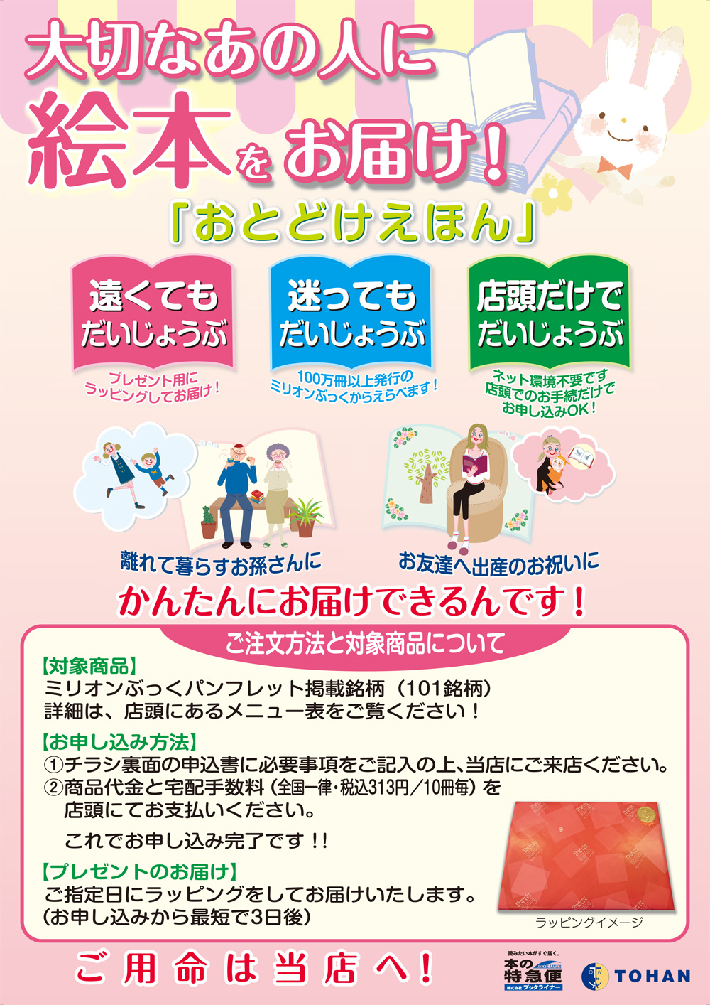 「おとどけえほん」は、書店店頭で対象銘柄の中から絵本を選んで申し込むと、プレゼント用にラッピングした商品を指定先に届けるものです。 受注から配送までのオペレーションは、トーハンの関連会社である株式会社ブックライナーが担当。客注専用システム「本の特急便」を活用し、お申込から最短3日でラッピングしてお届けします(ご指定日のお届けも可能です)。