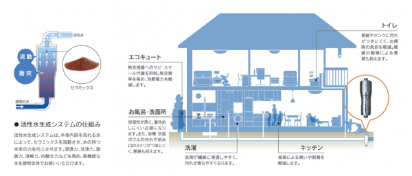 システムの本体内部を流れる水によりセラミックスを流動させ、水の浸透力、洗浄力、脱臭力、溶解力、抗酸化力などを高めます。飲み水や料理に使用するのはもちろんのこと、お風呂での利用や、赤ちゃんやペットのいるご家庭にも安心してご利用いただくことができ、メンテナンスフリーの画期的なシステムです。