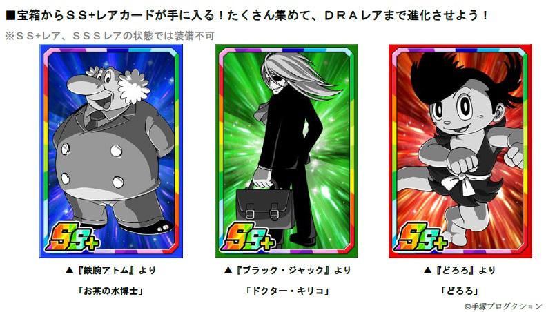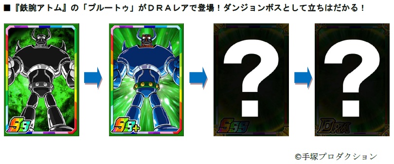 期間限定でスペシャルコラボダンジョンが登場します。ダンジョンでは、お馴染みのキャラクターたちが立ちはだかり、ダンジョンをクリアした時に手に入る「鉄腕P」を貯めると、SSレア「プルートゥ」、Sレア「青騎士」「ピノコ」「田之介」などの限定カードや、強化素材「ヒョウタンツギ」と交換することができます。さらにダンジョンで敵を倒した時に出現する宝箱からランダムで、SS+レア「お茶の水博士」「ドクター・キリコ」「どろろ」が手に入ります!