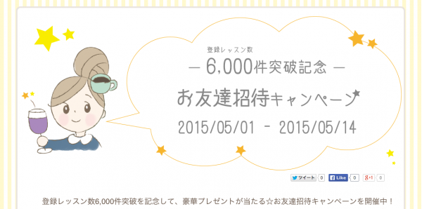 6,000レッスン突破記念とユーザー様への感謝を込めて、抽選でビックプレゼントが当たる「お友達招待キャンペーン」を開催します。