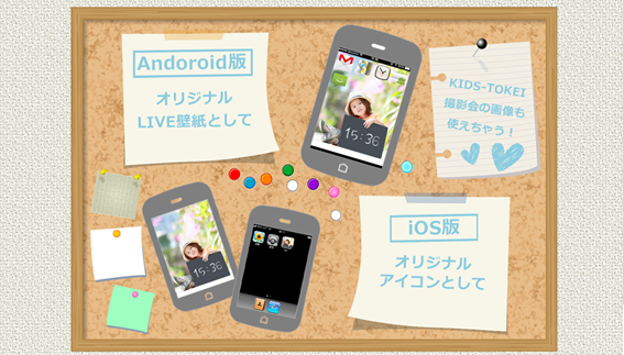パソコン、スマートフォンのどちらでも簡単に作成する事が出来るため、スマートフォンで撮影した写真はもちろんの事、KIDS-TOKEIの撮影会でプロのカメラマンが撮影した写真もご使用頂けます。