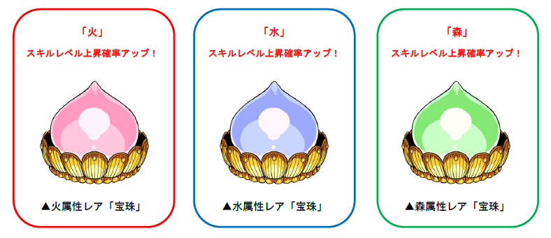 「宝珠」は経験値がアップするだけでなく、火・水・森のスキルレベル上昇確率もアップします。