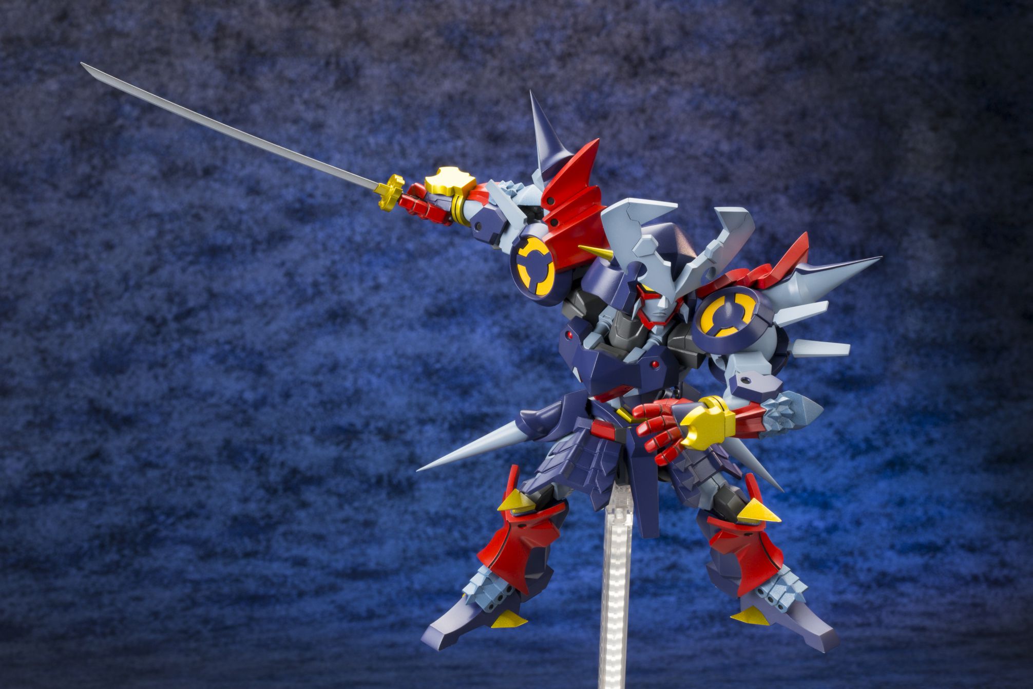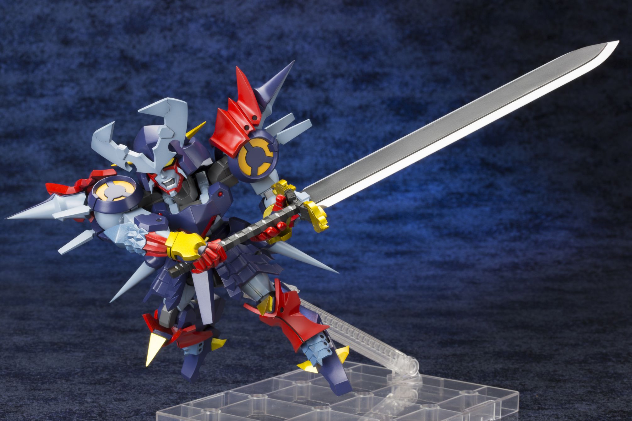 剣撃に特化した特機らしく、刀を構えたポージングが映える可動ギミックが特徴的なプラモデルです。ダイゼンガーの印象的な武器「参式斬艦刀」は、通常時・展開時の2種類が付属、展開時には全長250mmと本体を超える巨大な斬艦刀を構えたポージングも可能です。また、表情パーツも一部塗装済みで通常顔と咆哮顔の2種類が付属します。さらにコトブキヤショップ(秋葉原館、大阪日本橋、オンラインショップ)限定で、リアリティある仕上がりになる「ドレスアップメッキパーツ」が特典として付いてきます。