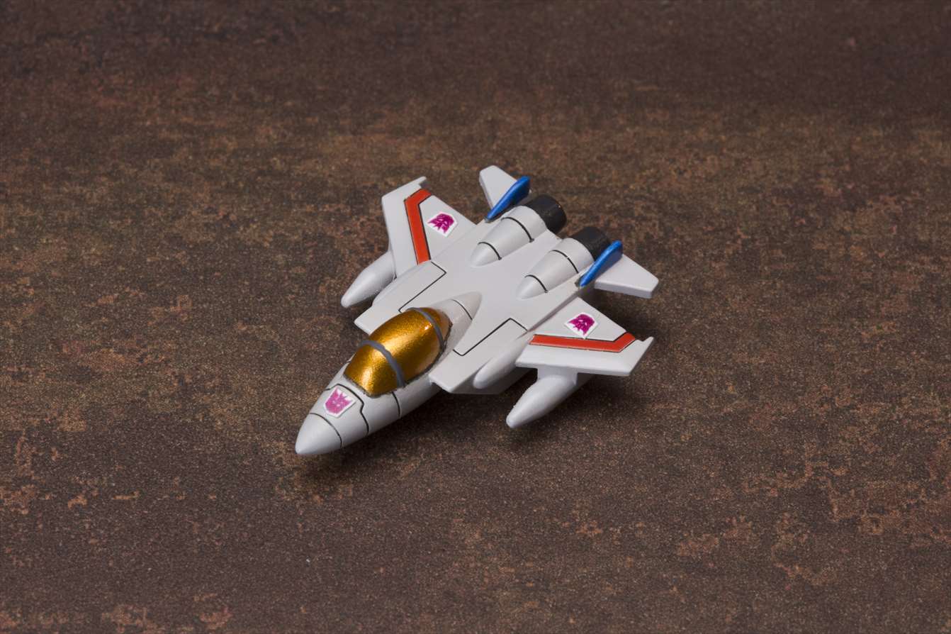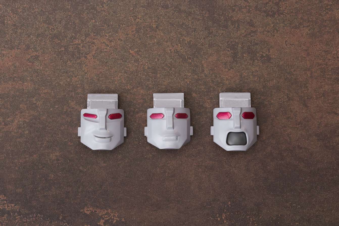 表情パーツは差し替えで通常顔・ニヤリ顔・叫び顔の3種類の表情に交換可能です。叫び顔は発売済みのメガトロンと組み合わせると「怒られている時」の表情としても使えるほか、攻撃時の叫び顔としても使用できます。胸部ハッチは展開してミサイルポッド発射シーンを再現でき、平手パーツ(右)を使用することでポージングに表情をつけることが可能です。成型色と一部塗装済みパーツにより組み立てるだけでイメージに近い仕上がりとなり、翼のデストロンのエンブレムは付属シールで再現可能です。ビークルモードをイメージしたジェット機が付属します。