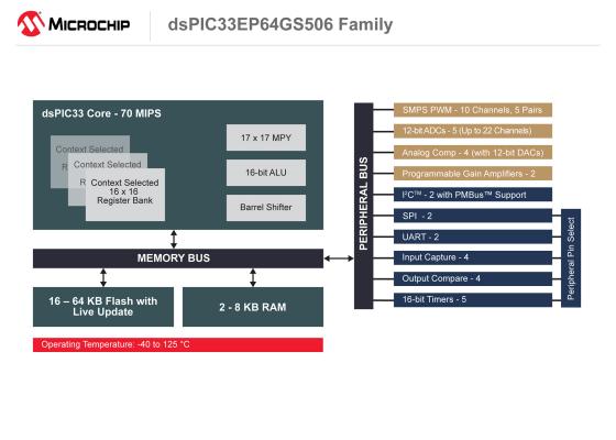 その他の特長として、dsPIC33EP「GS」ファミリは最大22 chのADC入力を備えた12ビットADCを最大5個内蔵しており、300 nsのADCレイテンシで16 Mspsの総スループットを実現しています。また、4つのアナログ コンパレータはそれぞれ12ビットDACを備えており、これまで以上に高精度な設計が可能です。2つの内蔵プログラマブル ゲインアンプは、電流検出等の高い精度が要求される計測に使えます。これら先進のアナログアンプをデバイスに内蔵する事で外付け部品の点数を抑え、コストと基板面積を削減します。これらの特長に加え、デバイス全体で高性能を実現したdsPIC33EP「GS」ファミリは、コンピュータおよび通信(例: AC/DCおよびDC/DC電源)、産業用(例: ソーラー インバータ、LED照明、HID照明、バッテリ充電器、プロジェクタ、溶接機)、車載(例: LEDおよびHIDヘッドライト、DC/DCコンバータ)等、幅広いアプリケーションに最適です。
