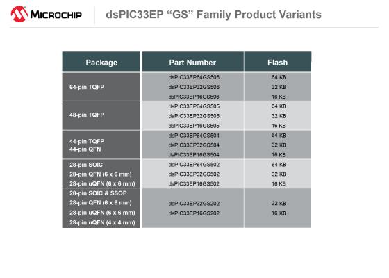 dsPIC33EP「GS」ファミリは28~64ピンの各種パッケージで14製品を提供します。各製品とパッケージの一覧は、製品一覧表でご確認ください。これらの製品は全て本日よりサンプル出荷と量産出荷を開始いたします。