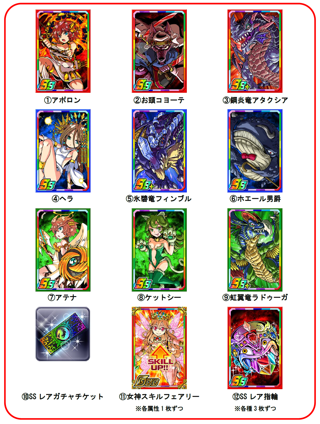 (11)女神スキルフェアリー(各属性1 枚ずつ) (12)SS レア指輪(各種3 枚ずつ)