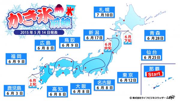 「かき氷前線」とは、かき氷が本格的に売れ始める(多くの人が食べたくなる)シーズン始まりの日を予想したものです。LBWでは、POSデータの解析から、各地のかき氷前線を、梅雨入りの平年日以降(北海道は7月以降)で、日中の気温が29度以上になる日と定義し、気象庁の予報に独自のアルゴリズムを加え、予想を算出しました。