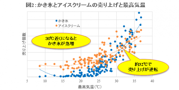 LBWの解析によると、かき氷の売り上げは、5月に入った頃から気温と連動し始め(図1)、概ね6月以降で日中の気温が30度近くになると急増して、約32度でアイスクリームの売り上げと逆転します(図2)。