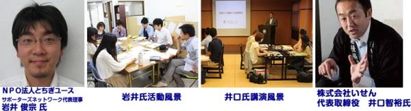 最終日5月30日(土)のパネルディスカッションは、新潟県越後湯沢から株式会社いせん代表取締役 井口智裕氏と、栃木県宇都宮市から、NPO法人とちぎユースサポーターズネットワーク代表理事 岩井俊宗氏をゲストスピーカーにお招きする。井口氏は、日本有数の豪雪地帯である越後湯沢の地域で旅館「HATAGO井仙」を経営している。周辺7市町村で構成される、「一般社団法人雪国観光圏」の設立にプランナーとして尽力し、「雪国食文化研究所」を設立した。岩井氏は、宇都宮を舞台に、若者の力を活かし社会課題を解決することを目指し、地域の中小企業と連携し、コミュニティづくり実践型インターンシップやビジネスプランコンテストを運営している。
