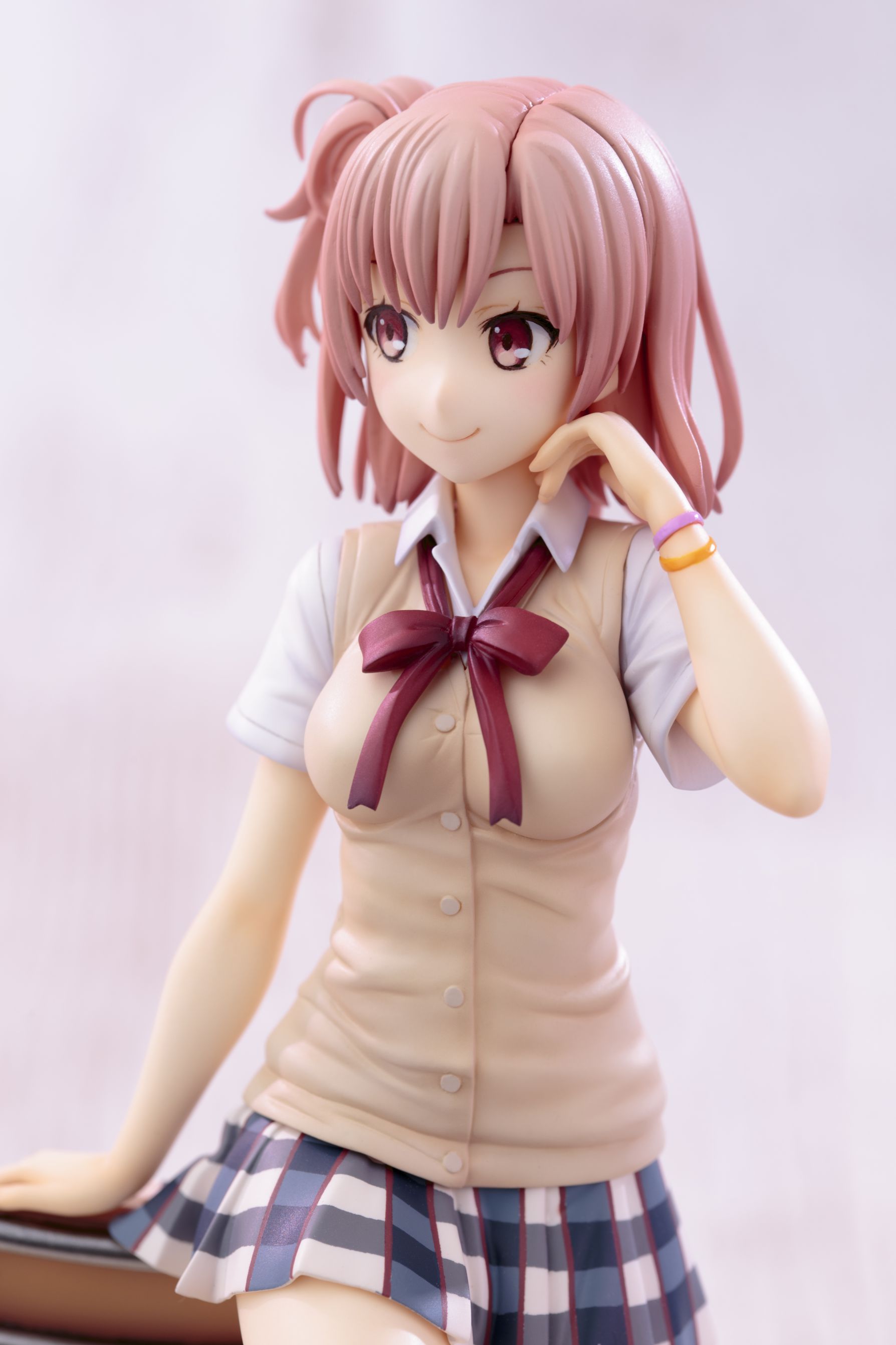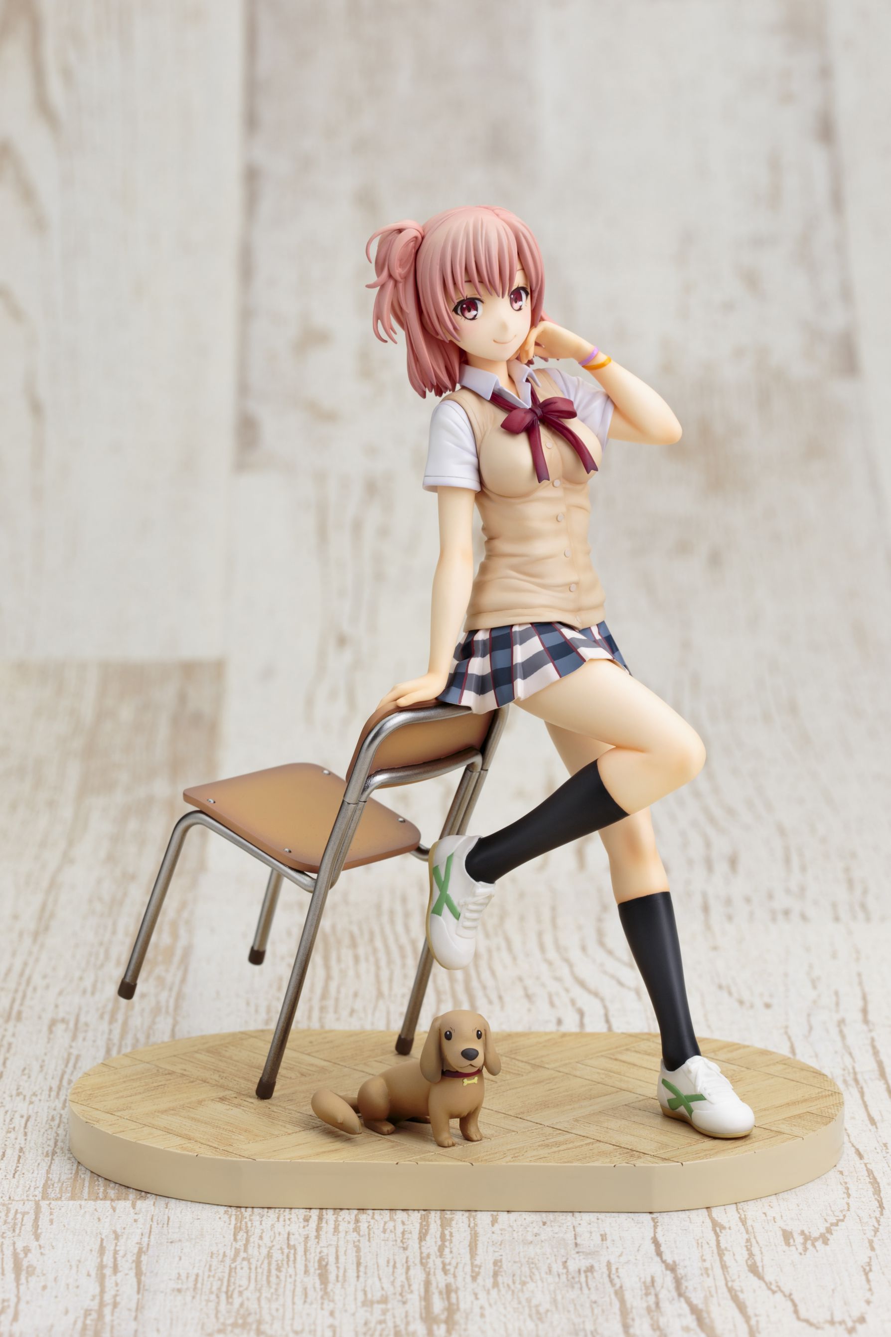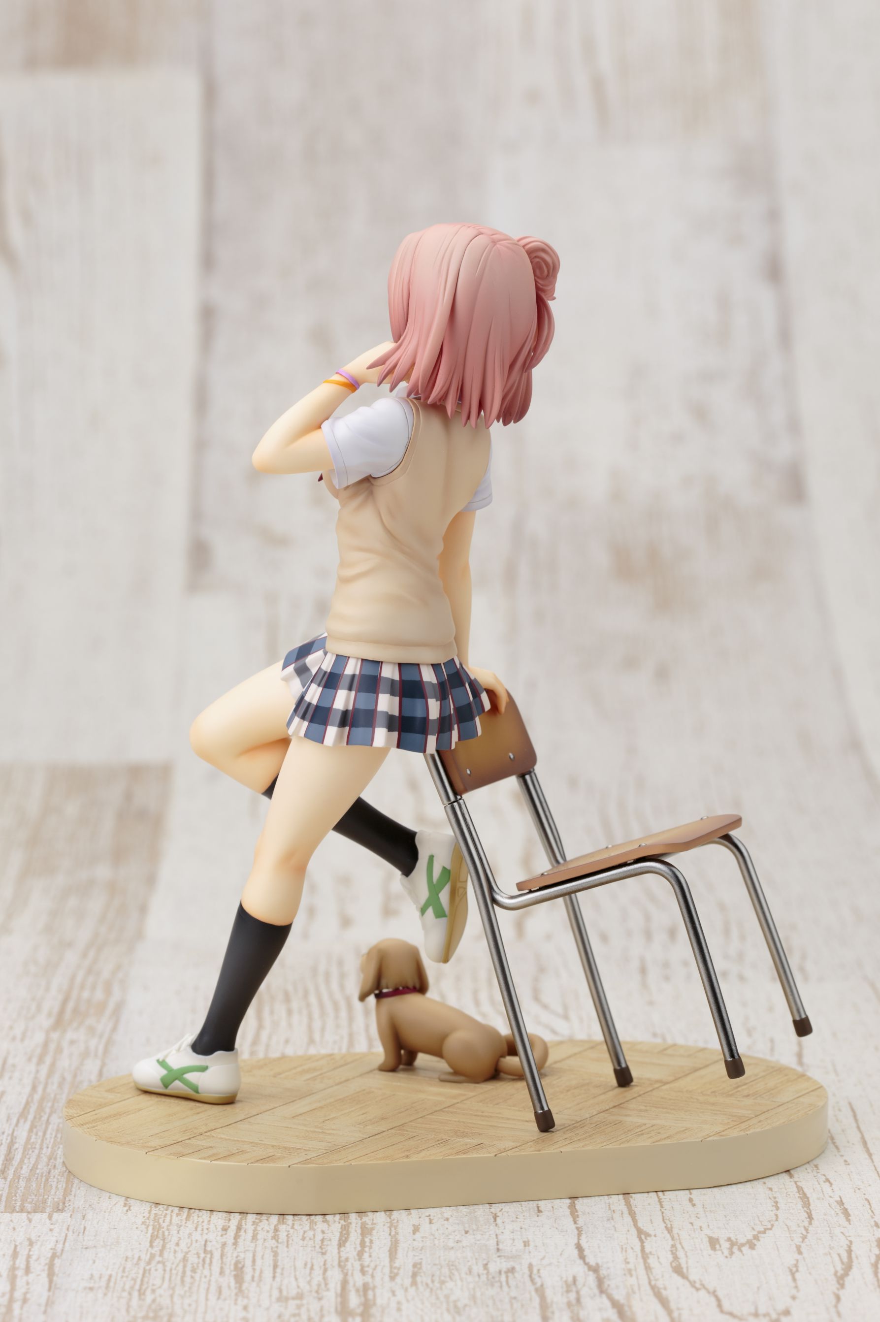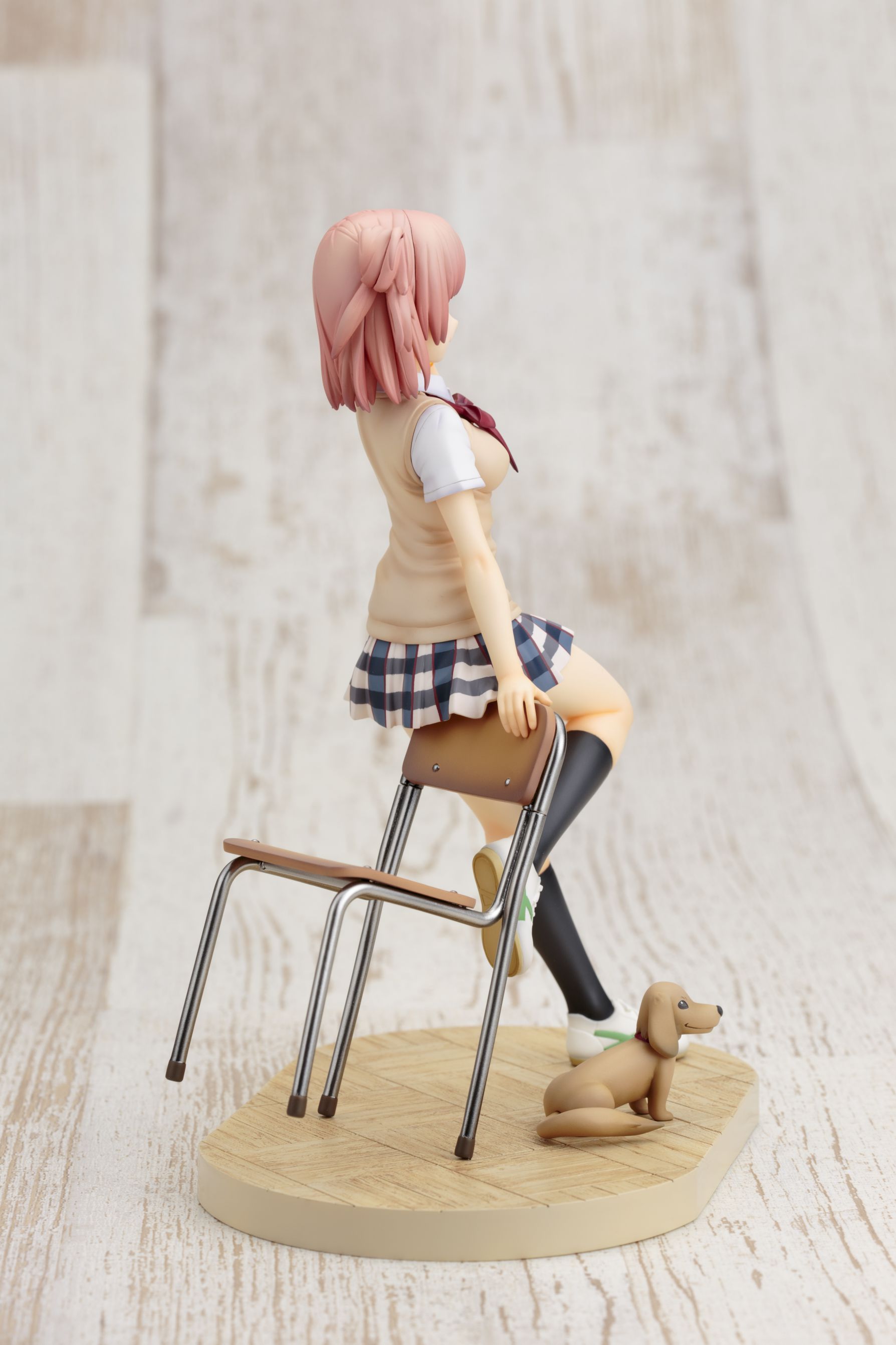 主人公・八幡のクラスメイトで奉仕部の部員「由比ヶ浜 結衣」を制服姿で立体化しました。ラフな仕草で教室の椅子に手をかけ、髪をそっと払って微笑みをうかべています。やわらかなサマーニットに包まれたメリハリのあるボディ、健康的な二の腕、短めのスカートからチラリとのぞく太ももなど、結衣の魅力を詰め込みました。続いて発売される「雪ノ下 雪乃」と並べて飾れる仕様となっています。さらに、コトブキヤ 秋葉原館、アニまるっ!限定で、フィギュアのポーズを再現したデフォルメイラストのラバーストラップが付属します。