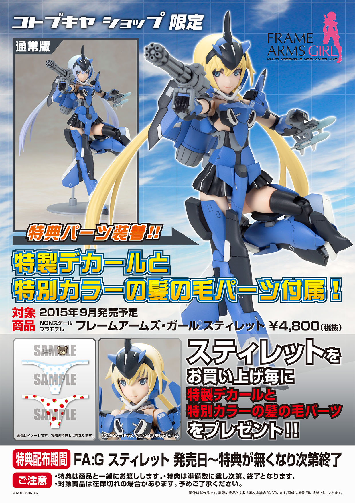 『フレームアームズ・ガール』とは、コトブキヤのオリジナルロボットコンテンツ『フレームアームズ』の各機体を“美少女化”したスピンアウトシリーズです。色分けされた成型色、タンポ印刷済みのフェイスパーツにより、塗装せずに組んだだけでも完成します。第2弾の「スティレット」には、表情パーツが4種、武器として日本刀、ガトリングガン、ハンドミサイルが付属します。『フレームアームズ』の特徴である各部の複数の3mm径の穴とPVC製の手首により、膨大なM.S.Gのウェポンシリーズやフレームアームズシリーズの武器や外装を使用する事ができます。自分だけのフレームアームズ・ガールをカスタマイズして楽しめます。さらにコトブキヤショップ(秋葉原館、大阪日本橋、オンラインショップ)でお買い上げ毎に、“特製デカール”と“特別カラーの髪の毛パーツ”が付属します。
