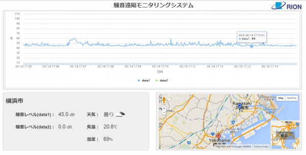 具体的には、SA-A1が取得した騒音データをSensorCorpusのクラウドに送信・蓄積し、その上で、地図上の位置、及び、別途ネット上から取得した現地の気象情報と組み合わせて、スマートフォンやタブレット、PC等のダッシュボードに表示します。計測データは本社や関連部署、外出中の担当者等と共有でき、外部データと組み合わせて表示ができます。また、計測データが閾値を超えた場合に、メールで通知を行います(アラート機能)。例えば、工事現場で設定済みの判定レベルを超えて騒音が発生した際、直ちにその情報が関係者に届きます。なおこのサービスのデモは、「人とくるまのテクノロジー展2015」(*4)のリオンブースで展示します。
