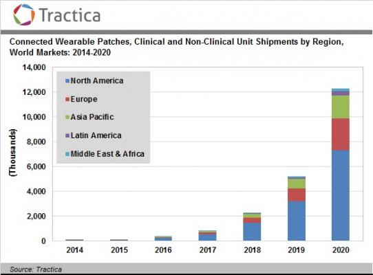 トラクティカ社の新刊レポートは、世界の医療用と非医療のコネクテッドウェアラブルパッチの年間出荷台数は2014年の6万7000ユニットから2020年までに1230万ユニットへ成長すると伝えており、同期間におけるパッチ市場の年間市場規模は33億ドルへと増加していくだろうと見込んでいる。