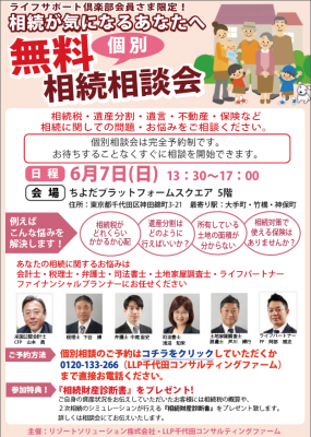 企業・団体の福利厚生代行サービスからゴルフ場やホテル、複合リゾートなどの運営&運営支援までを手掛けるリゾートソリューション株式会社(略称:リソル、東京都新宿区、多賀道正社長)では、福利厚生代行サービス「ライフサポート倶楽部」会員をはじめとするリソルの各種会員様を対象に、会員ならではのお得な宿泊プランや生活メニュー、会員イベントやセミナーなど様々なサービスを提供しておりますが、来る6月7日(日)には、相続税や遺産分割、遺言、不動産、保険などに関する「相続対策」無料相談会(予約制、別添資料参照)を東京・千代田区において開催いたします。