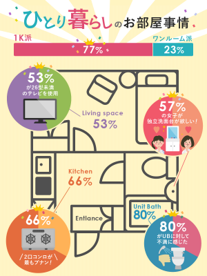 「一人暮らしの間取りはワンルームがいいですか?それとも1Kがいいですか?」というアンケートを行った結果、77%の人が1Kがいいと回答した。やはり寝る場所とキッチンの場所が同じだと匂いが付くというような意見が多くあり、水周りと生活空間は別にしたいと思っている人が多いことが分かった。