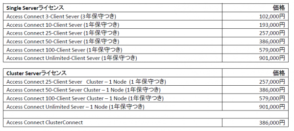 ・クラスタ構成のWindowsサーバー上でご利用の場合、「Cluster Serverライセンス」をクラスタに参加しているノード数分と「Access Connect ClusterConnect」1ライセンスが必要となります