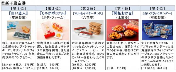 1~4位までは昨年と同じランキングとなり、定番商品がずらりと並びました。5位には若者を中心に人気のブラックサンダーの北海道限定バージョン『白いブラックサンダー』がランクインし、北海道の新しいお土産に仲間入りしました。[新千歳空港担当談]