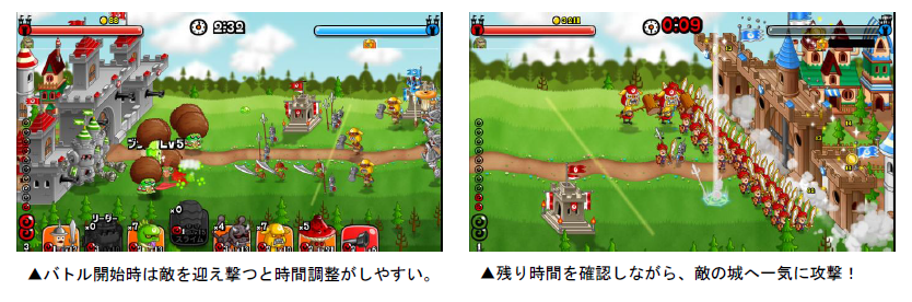 「防衛デッキでバトル」や、対象のバトルで残り時間10秒以下で敵の城を落城させると