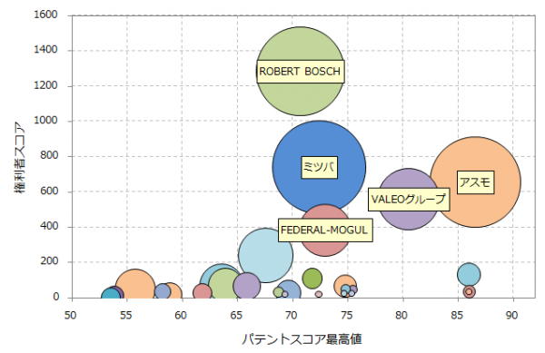 総合力上位3社の有効特許件数に大きな差はありませんが、総合力ではROBERT BOSCH(以下BOSCH)が他の2社よりも高くなっています。BOSCHはワイパーブレードに関して注目度の高い特許が多くなっています。これは総合力3位のアスモも同様であり、総合力2位のミツバはワイパーアームや駆動方法について注目度の高い特許が多くなっています。