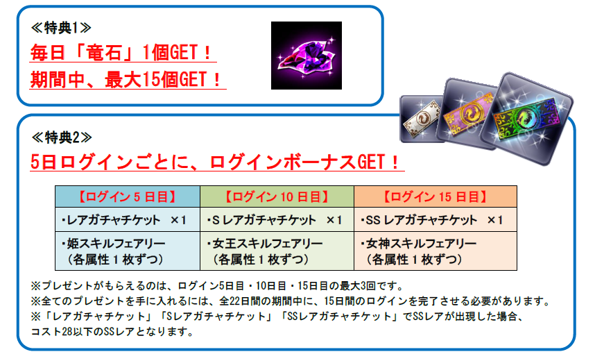期間中、ゲームにログインすると、最大15日間「竜石」が1日1個もらえます。