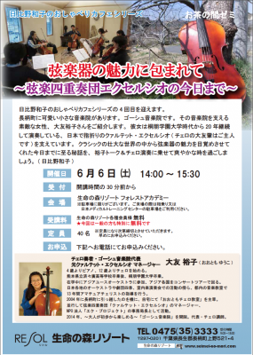 < 『いきがい・絆・健康・くつろぎ』 情報 >生命の森リゾート「お茶の間ゼミ」の日程:6月「弦楽器の魅力」「国蝶オオムラサキ」「パプアニューギニア」「四季音楽祭」