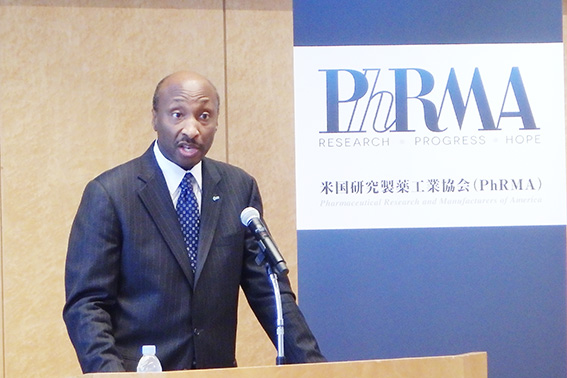 フレージャー会長は、「政府や関係省庁の長年の努力により、日本の医療政策環境は大きく進歩した」と述べ、健康長寿社会の実現と創薬イノベーションのさらなる推進に向けて、「隔年の薬価改定維持」、「新薬創出加算の制度化」、「新薬の14日間処方規制の見直し」、「科学的根拠によるワクチンの評価」、「トランスレーショナルリサーチの支援」などに対するPhRMAの政策提言を紹介しました。