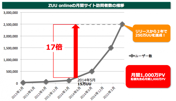 株式会社ZUU(代表取締役社長兼CEO:冨田和成、以下弊社)が運営する金融経済メディア「ZUU online」は、月間ユーザー数250万人、月間1000万PV(配信先での閲覧数を含めると約2000万PV)を突破しましたことをお知らせ致します。