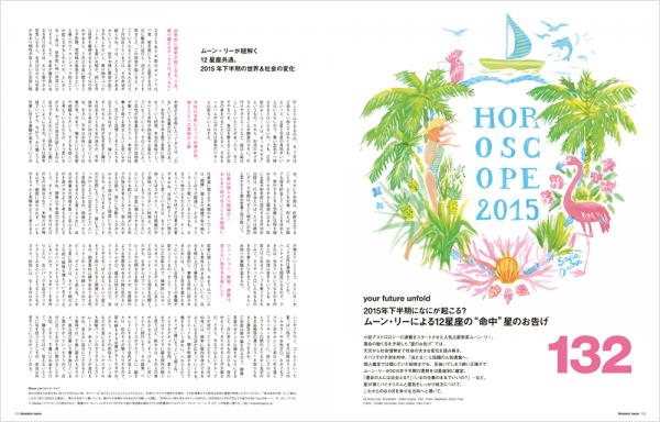 そんなムーン・リーが、2015年5月28日発売のヌメロ・トウキョウ2015年7・8月合併号で今年の下半期を占っています。下半期のポイントとなるのが、一度、射手座に入った土星が6月15日に蠍座に逆行し、凶アスペクトを取るという星の動き。この状態が起こると様々なことが乱れ、7月18日頃まではその余波が続くという。空や大地に異変が起こったり、乗り物やコンピューターにも悪い兆候があるほか、6月はテロ関係、7月は株価急落などのお金に関することに特に注意が必要だと。