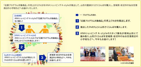「さくらんぼ東北応援プログラム」とは、ECサイト「ANAショッピング A-style( http://www.astyle.jp/ )」内で販売している対象商品(さくらんぼ3商品※2)の売上金の一部(5%)を拠出金として、山形の生産者よりさくらんぼを購入し、東北の復興を応援するプログラムです。本プログラムでは、拠出金をさくらんぼ購入のための寄付金として充当するだけではなく、ANAショッピングA-styleの社員スタッフが山形の農園に赴き、生産者の方々にご協力を頂きながら早朝にさくらんぼを収穫し、その日のうちに東日本大震災で被災した小学校や仮設住宅にお住まいの方々にお届けしています。