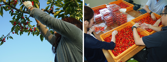 ANAショッピングA-styleスタッフが一つ一つ手積みし、仮設住宅の皆様と一緒に、さくらんぼをパッキングします。