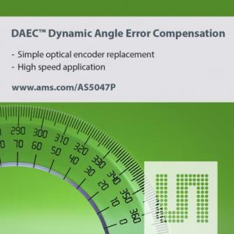 AS5147Pは、特許技術DAECTM(ダイナミック・アングル・エラー補正)を搭載し、極めて高い回転速度であっても正確な位置測定を行います。DAEC補正スキームは、センサのシグナルチェーンにつきものの伝播遅延をほぼゼロまで減らします。その結果、AS5147Pの角度誤差は1.7krpmで0.02°、14.5krpmで0.17°、28krpmで0.34°とごくわずかです。さらにDAECは、デバイスが1.9usごとに測定出力をリフレッシュできる機能を有しています。