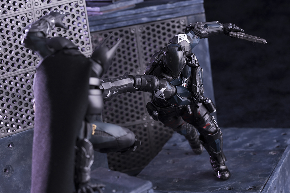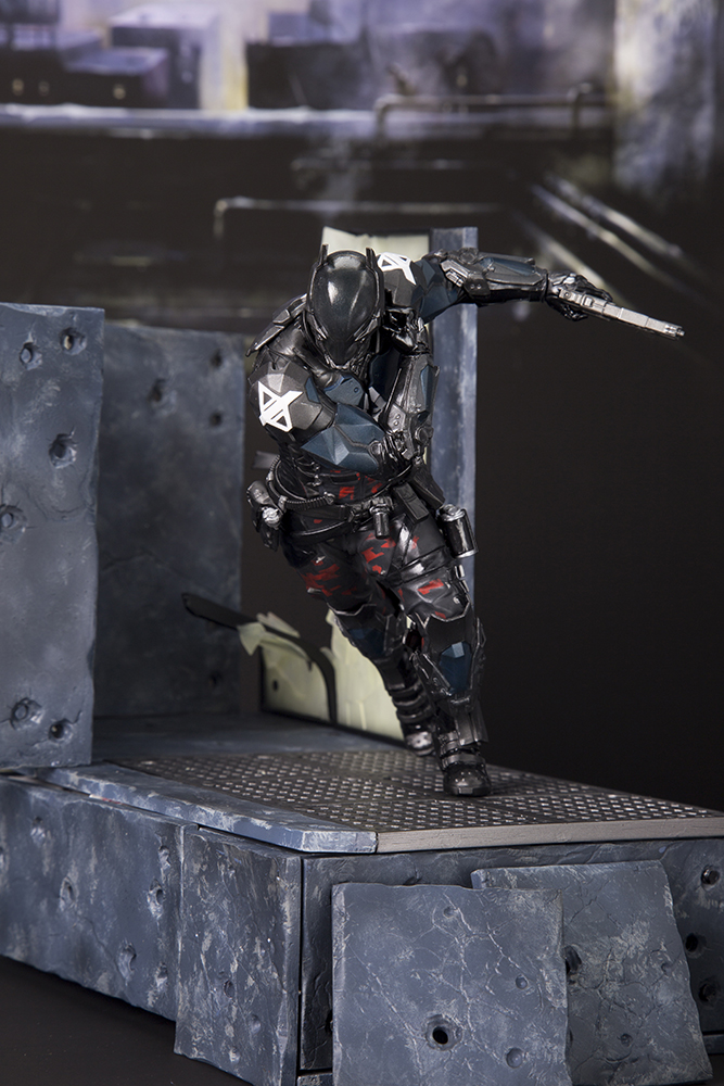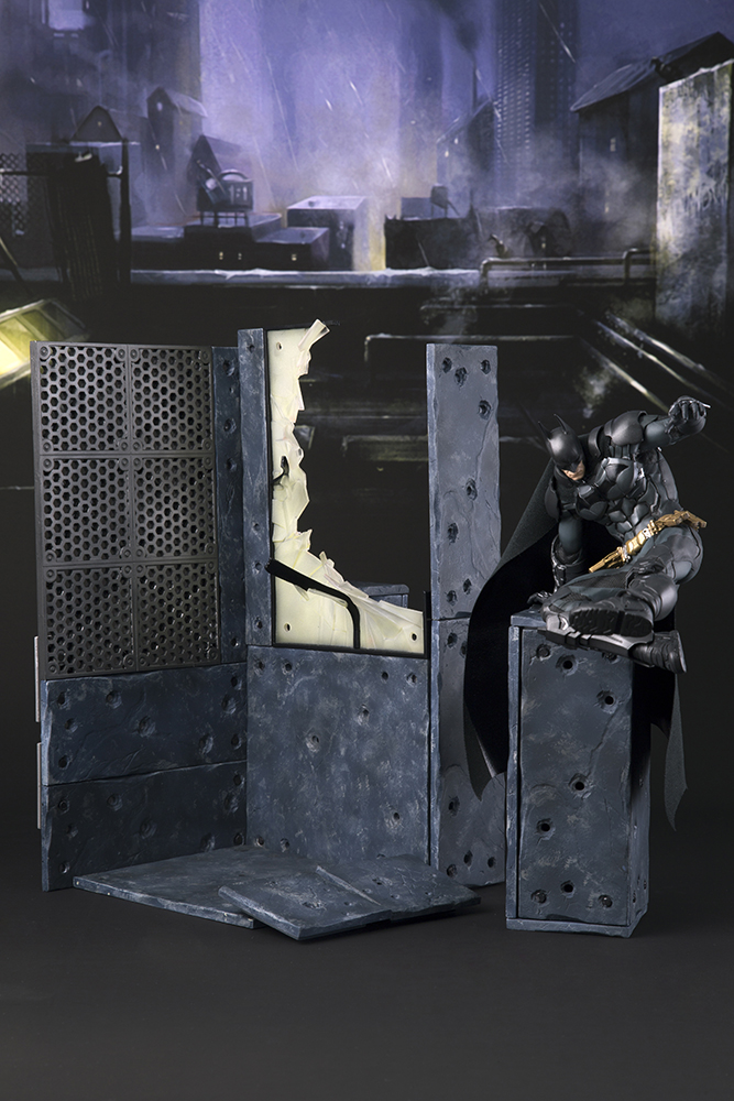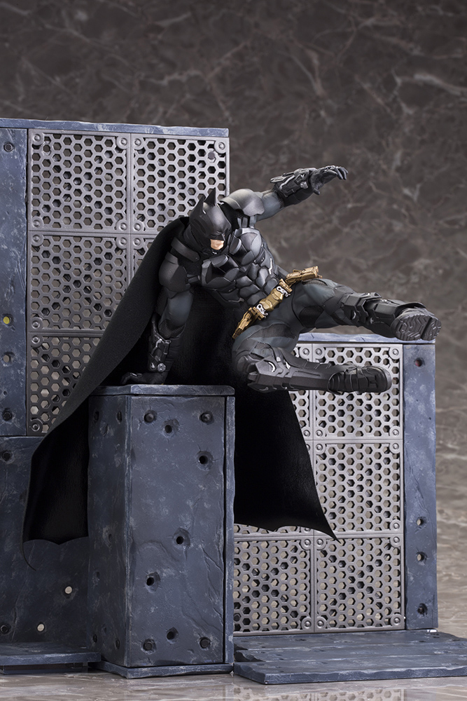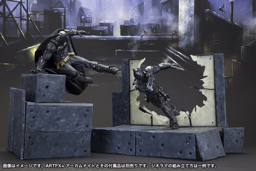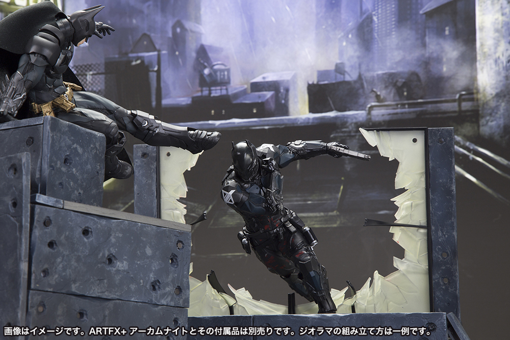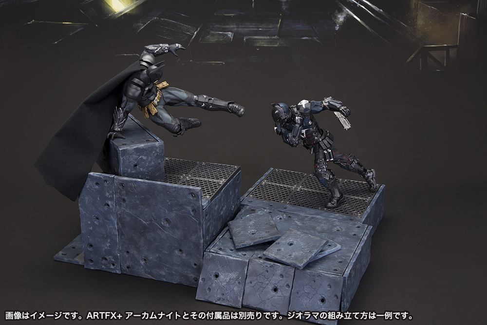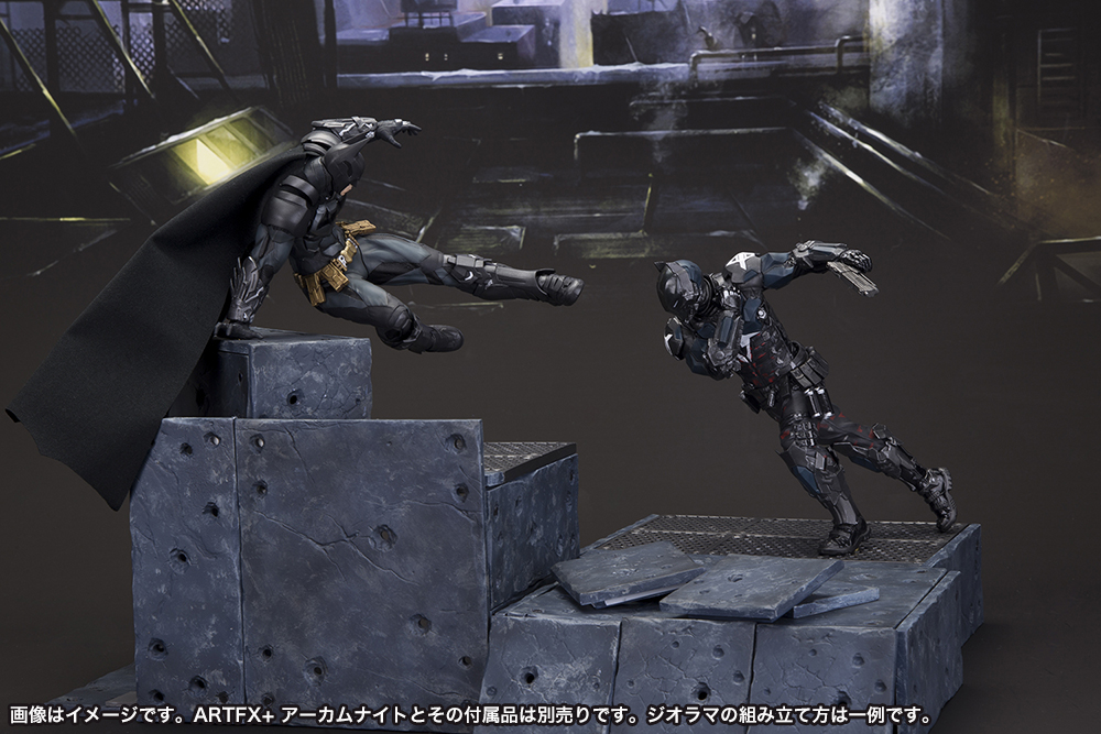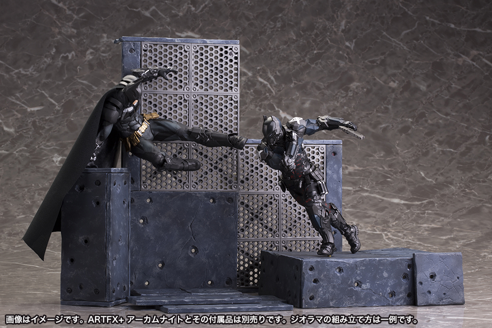 『バットマン:アーカム』シリーズ話題の新作より、1/10スケールでコレクション性にすぐれた「ARTFX+」で、バットマンとアーカム・ナイトの2体を臨場感のあるアクションポーズで立体化。本商品最大の特徴として、「ビルドアップ・ジオラマベース」を採用しました。都市の建造物をモチーフとした各種台座パーツとジョイントパーツが付属し、ある時は廃墟と化した工場、またある時は金網がそびえる外壁、そして薄暗い回廊など、様々な環境をスナップフィット式の簡単な組み立てにより完成させることが出来ます。また、台座パーツの穴は直径4mm径で統一されており、当社一部商品に付属する径の適合する可動アームパーツを接続する事で、更に自由度の高いディスプレイも行えます。2体揃えて、宿命の対決を再現してお楽しみ下さい。