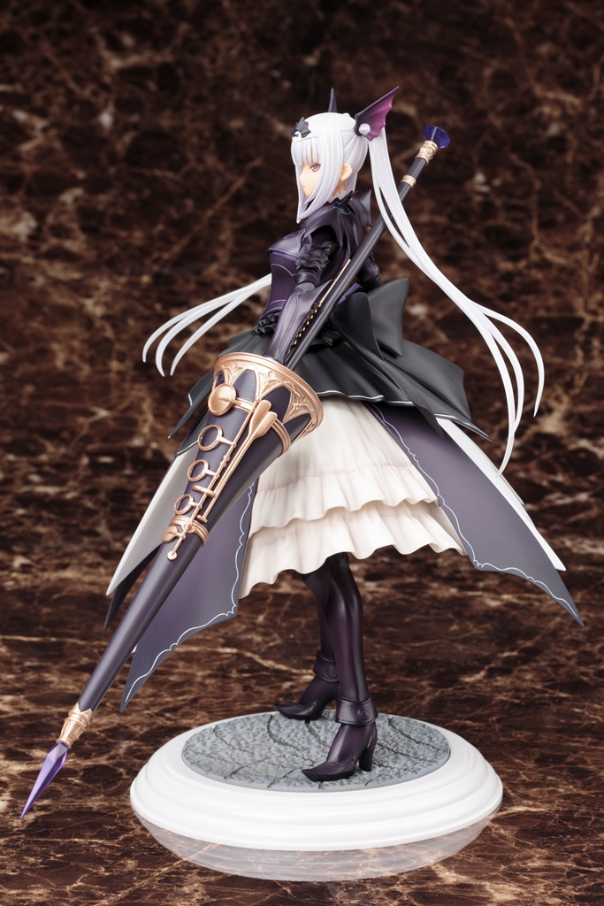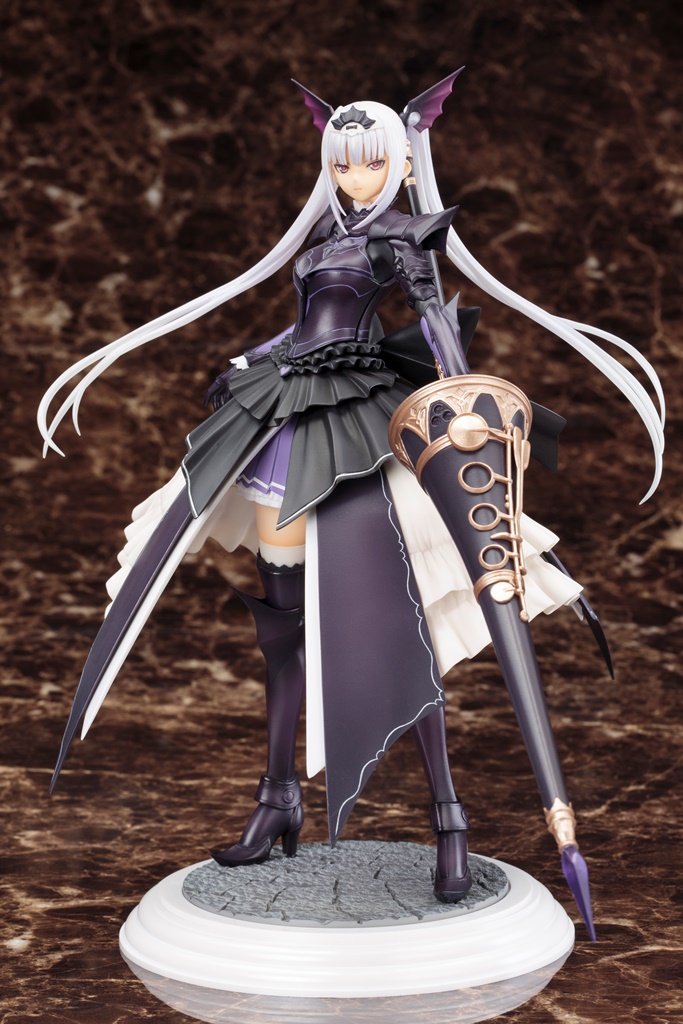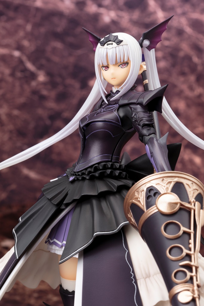 「エクセラ」は主人公たちの前に立ちはだかるロンバルディア帝国の皇女、七つ目の竜刃器・龍吼魔笛グラビネットを使う竜奏騎士(ドラグナー)です。黒と白を基調とした巨大な鎧に身を包み、颯然と相手を見据えた姿で立体化しました。柔らかくなびく銀髪や、グラビネットの両端に設えられた鉱石の透明感と硬質感を再現するため、クリア素材を使用し、それぞれの肌合いに適した塗装を施しています。竜の表皮を想起させる硬質的な装甲と、大きな柔らかいドレスフリルのコントラストが特徴的な鎧は、デジタル造形により、装甲やフリルが幾重にも重なり合った複雑なパーツ構造を再現しました。更に、デジタル出力した原型を元に、デリケートなラインは手作業にて調整を繰り返し、シャープな中に女性らしさを含んだデザインを忠実に再現しています。印象的な武器「龍吼魔笛グラビネット」も大きさを忠実に、細工にも拘っています。