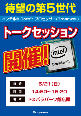 ドスパラパーツ館にて、テクニカルライター高橋敏也氏、鈴木雅暢氏によるIntel新CPU発売記念イベント『Broadwellの使い所はこれだ!詳細ベンチマーク結果を解説』を行います。