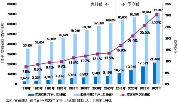 国土交通省の平成26年度「住宅着工統計」によると、2014年度の新設住宅着工戸数は88万戸で、5年ぶりに減少に転じました。NRIの予測*1では、2030年度までに新設住宅着工戸数が53万戸に減少すると見込んでいます。しかしながら、新設住宅着工戸数が減少しても、それを上回るスピードで世帯数の減少が見込まれます。このため、既存住宅の除却や、住宅用途以外への有効活用が進まなければ、2033年の総住宅数は約7,100万戸へと増大し、空き家数は約2,150万戸、空き家率は30.2%にいずれも上昇すると予測されます。